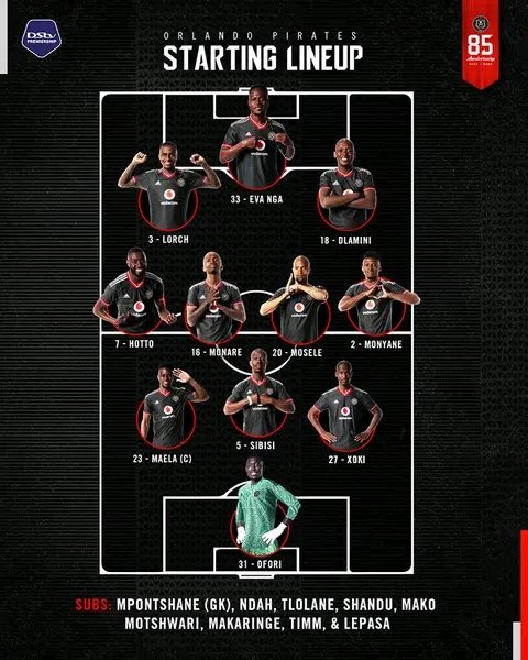 Orlando Pirates XI: Ofori , Maela , Sibisi , Ndah , Shandu , Motshwari , Mosele , Tlolane , Dlamini , Lorch , Eva Nga